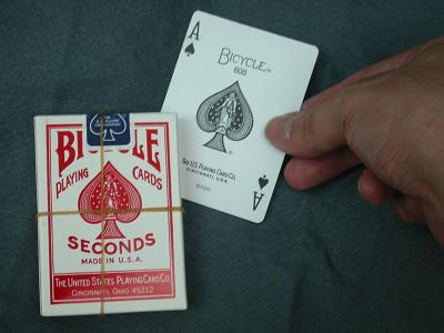 | 描述:四張空白的牌,將一張白牌放在桌上,手中的三張牌當中有一張是A,一下子這張A消失了?出現在桌上那張白牌上? 將一張白牌又放桌上!把A放進手中。魔術師問觀眾A的位置?翻開桌上那張還是白色的!魔術師手中的那三張牌卻??會讓你有意想不到的結局!!